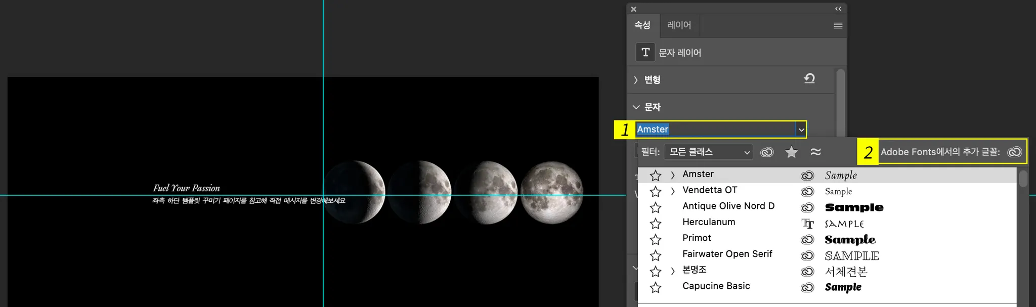 속성 창 문자 레이어에서 폰트 클릭하고, 원하는 폰트 선택하기