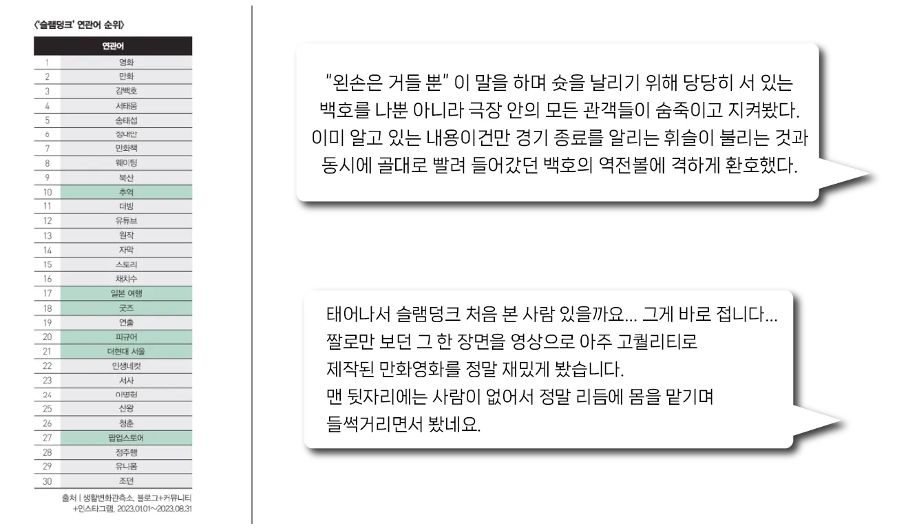 소셜미디어에 나타난 〈슬램덩크〉에 대한 관심 역시 놀라운 흐름을 보여준다. 대개의 브랜드나 상품이 그렇듯 영화도 개봉 첫 주나 그 다음 주에 관심도가 정점을 찍은 후 하락하기 시작하는데, 〈슬램덩크〉는 개봉 3주 차에 다시 한번 피크를 찍었다.