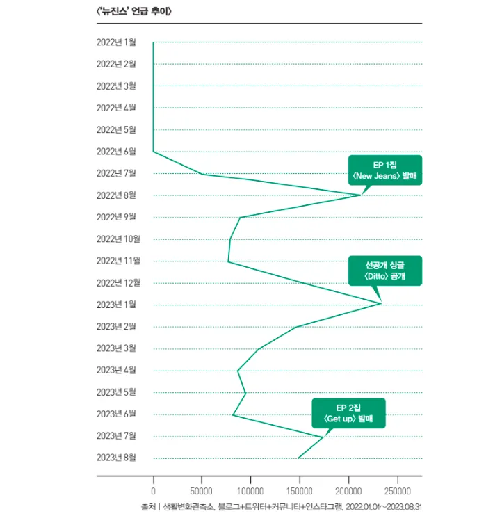 K-POP 씬에서도 이와 유사한 피크점과 추세선을 만드는 이들이 있다. 국민 아이돌을 넘어 글로벌 아이돌을 향해 가고 있는 뉴진스가 그 주인공이다. 도표에서 보듯 뉴진스는 데뷔 EP 〈New Jeans〉 발매 시점인 2022년 8월, 싱글 1집의 선공개 싱글 〈Ditto〉를 공개한 2022년 12월 직후, 그리고 EP 2집 〈Get up〉을 발매한 2023년 7월 등 세 차례에 걸쳐 소셜미디어 언급량이 피크를 찍었다.