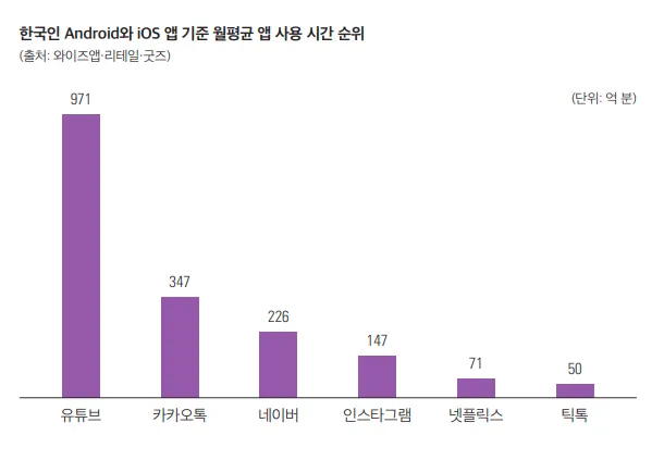 이러한 변화는 디지털 네이티브 세대뿐만 아니라 중장년층 및 노년층에게도 적용된다. 앱·리테일 분석 서비스 와이즈앱·리테일·굿즈에 따르면, 유튜브는 2023년 상반기 한국인이 가장 오래 사용한 앱으로 월평균 사용 시간이 971억 분에 달했다. 카카오톡, 네이버가 그 뒤를 이었는데, 사용 시간 2, 3위 앱과 비교했을 때에도 유튜브가 압도적으로 높은 이용 시간을 보인다.
