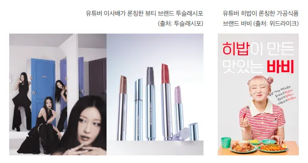 2023년 2월, 200만 명이 넘는 구독자를 보유한 뷰티 유튜버 이사배는 뷰티 브랜드 '투슬래시포(TWO SLASH FOUR)'를 론칭했고, 152만 구독자를 보유한 먹방 유튜버 히밥은 2023년 7월에 제주 특산물 가공식품 브랜드 '바비(BABI)'를 11번가에서 론칭했다.